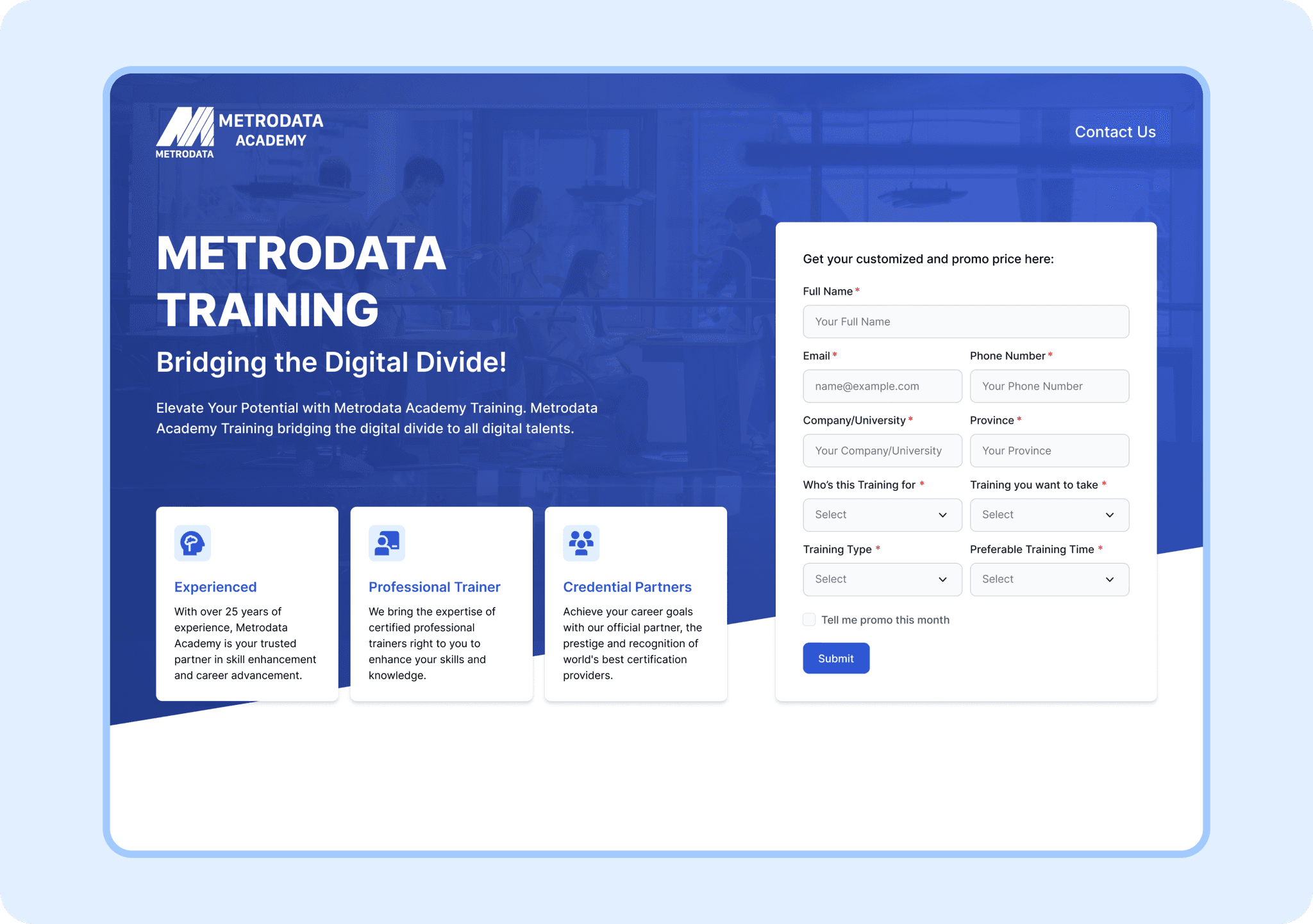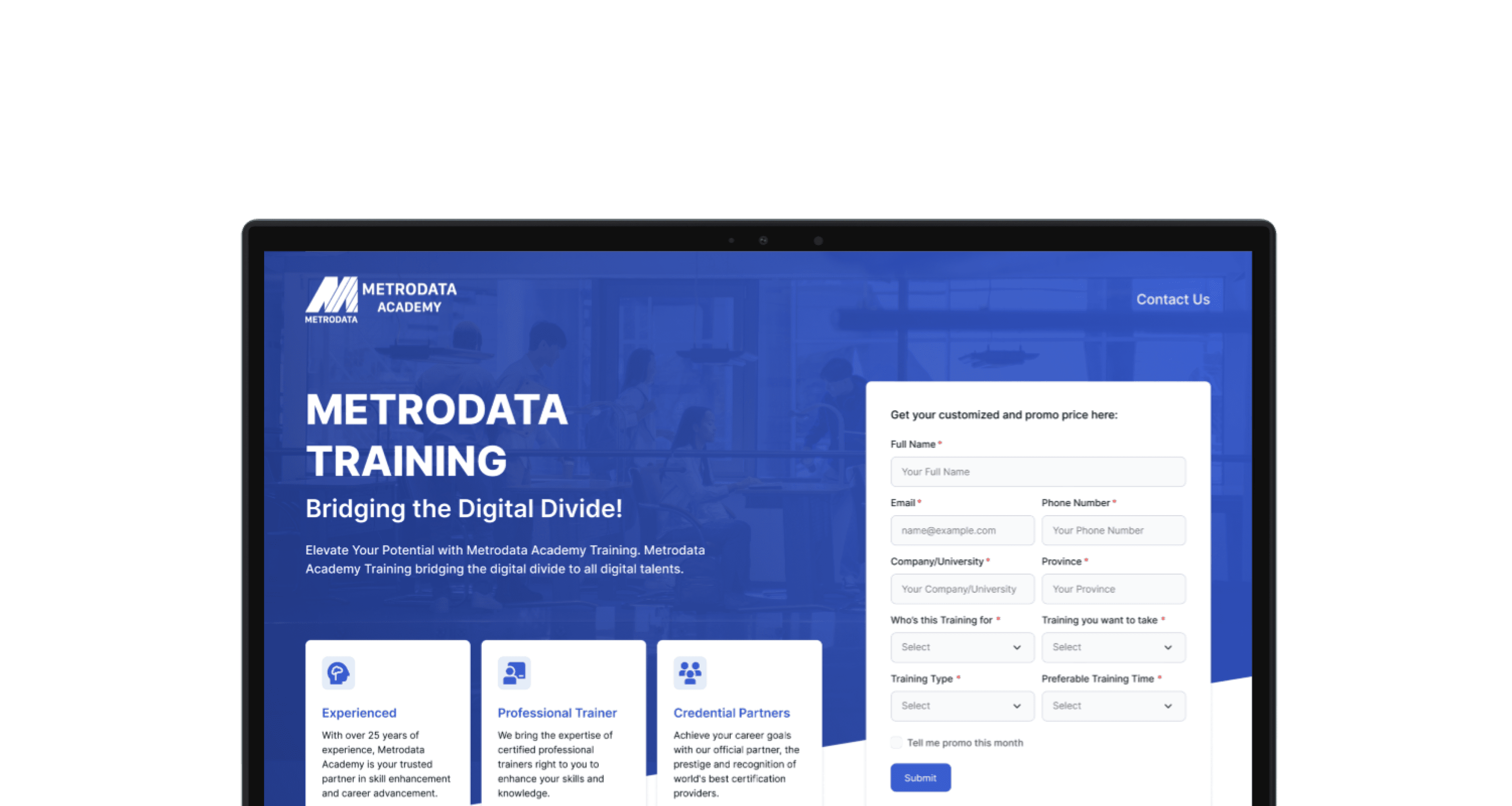When a training schedule becomes available and matches the preferences or interests indicated in the submitted data, the Metrodata admin team will reach out to the respective individuals via email. This approach ensures that potential participants are informed about relevant training opportunities, enabling them to take advantage of the programs offered by Metrodata Training.